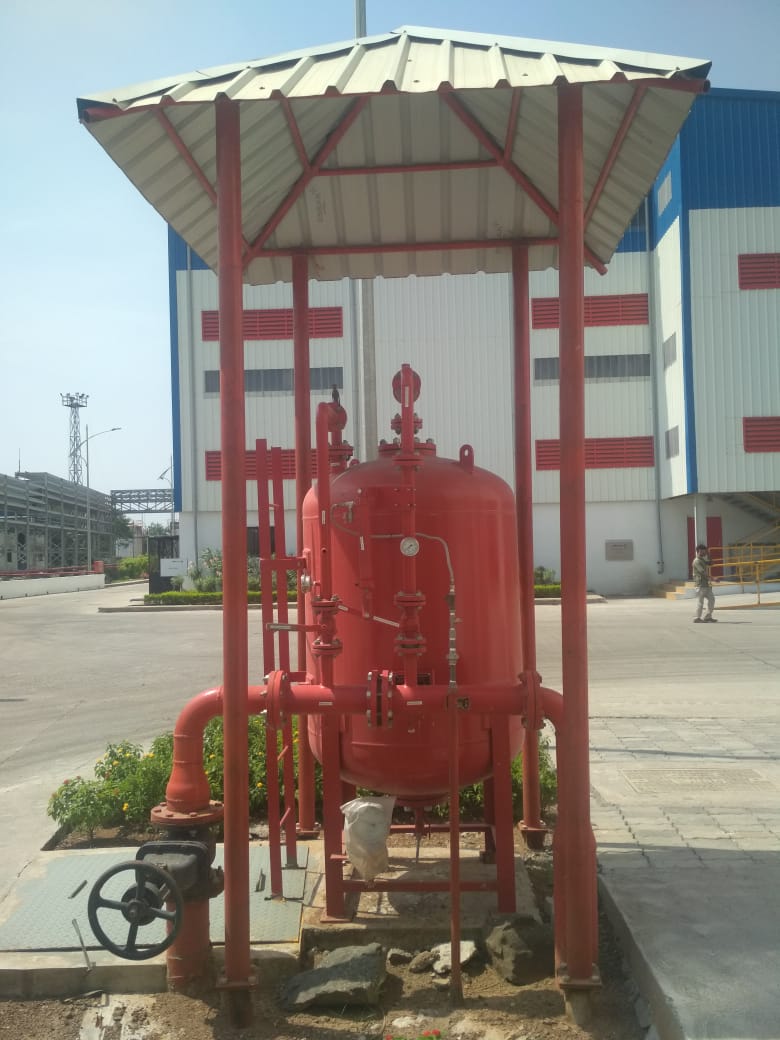 the water shall flow through the piping and Inline Inductor to induce foam from the foam tank in the water stream to flow water and foam solution to foam sprayer mounted on the ceiling of the plant. At foam sprinklers the foam shall be generated due to air induction and the finished foam shall be gently applied and spread on the fire.